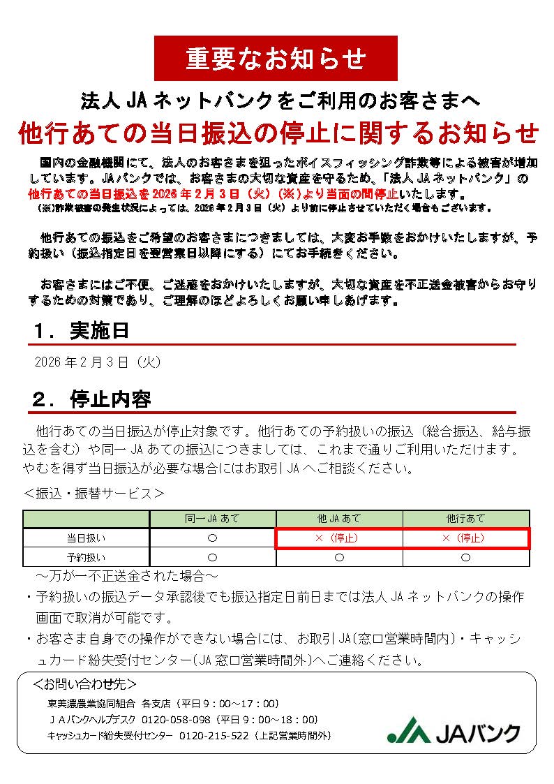 【お知らせ】他行あての当日振込の停止に関するお知らせ