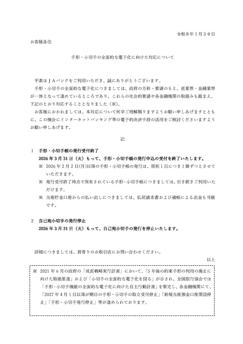 【お知らせ】手形・小切手の全面的な電子化に向けた対応について