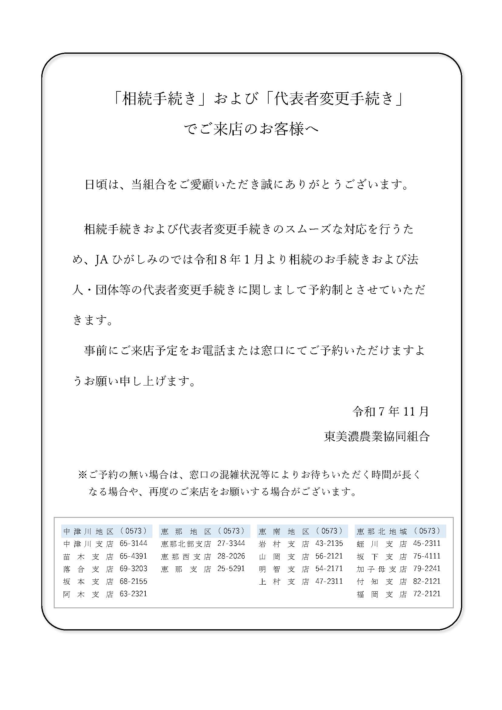 「相続手続き」および「代表者変更手続き」でご来店のお客様へ