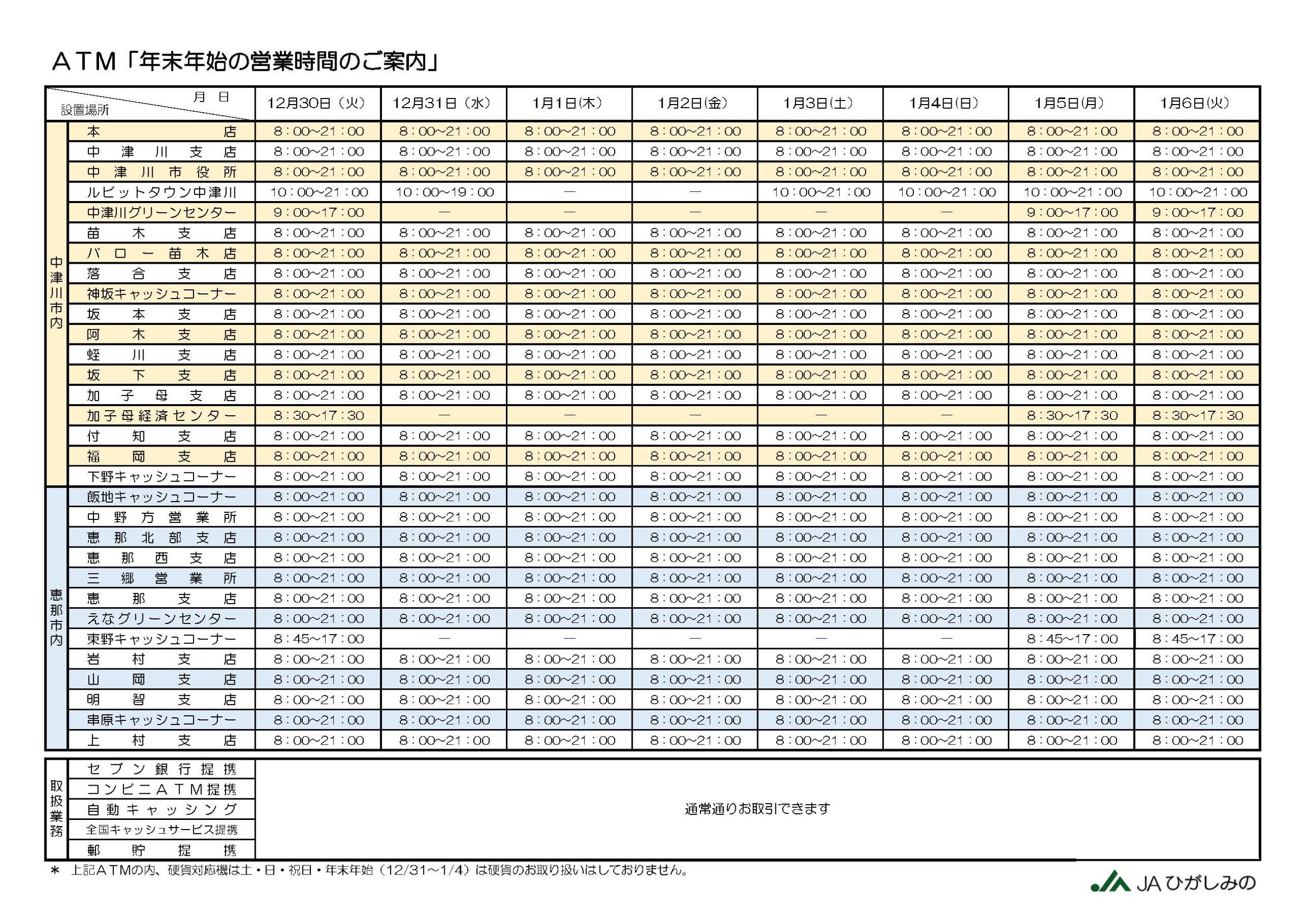 ATM「年末年始の営業時間のご案内」