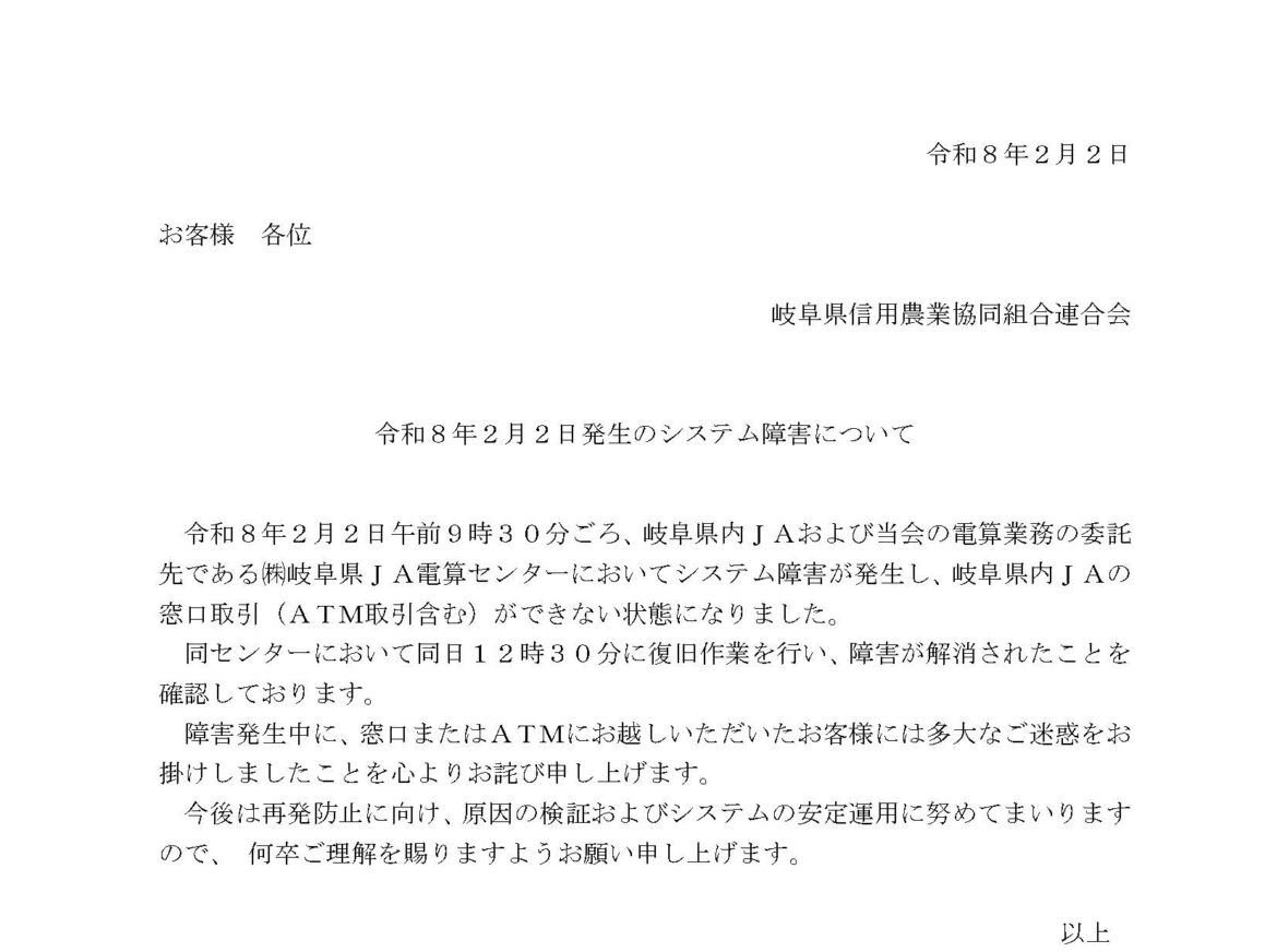 【お知らせ】令和8年2月2日発生のシステム障害について